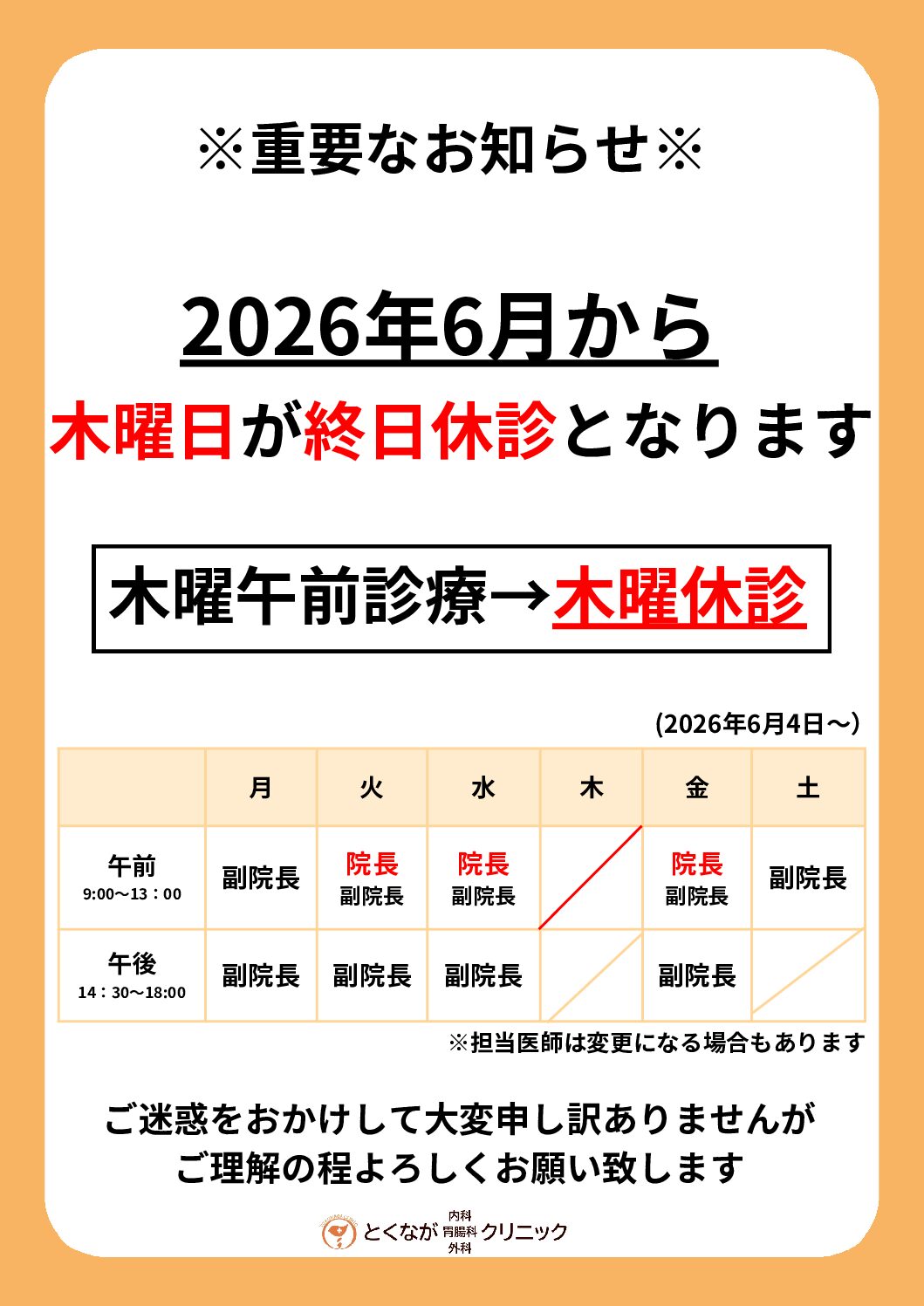 このたび人員不足のため、2026年6月より木曜日を終日休診とさせて頂くことになりました。